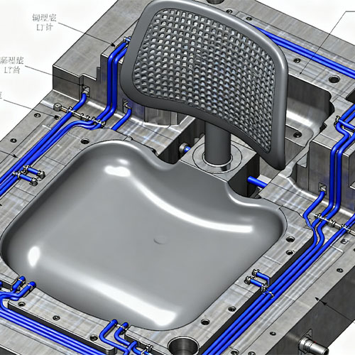 การออกแบบช่องแม่พิมพ์: ใช้แม่พิมพ์ช่องเดียวหรือสองช่อง (แม่พิมพ์ที่นั่งเก้าอี้ 1 แม่พิมพ์ 1 ช่อง แม่พิมพ์เท้าระดับห้าดาว 1 แม่พิมพ์ 2 ช่อง) สำหรับโครงสร้างกลวง แม่พิมพ์มีกลไกการดึงแกนเพื่อให้แน่ใจว่าการก่อตัวของรูสมบูรณ์